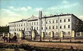 Но только 1 июля 1845 года институт начал приём воспитанниц. Первое здание института было деревянным и располагалось на улице Шелашниковской (в настоящее время улица Октябрьской революции). На содержание здания и учебного заведения средства дали купцы и золотопромышленники, в числе которых были Е. А. Кузнецов[2], П. В. Голубков, Н. Ф. Мясников[3], А. Я. Немчинов и другие.[4]