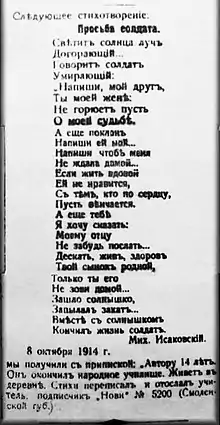 Михаи́л Васи́льевич Исако́вский (7 (19) января 1900 год, дер. Глотовка, Ельнинский уезд, Смоленская губерния, Российская империя — 20 июля 1973 года, Москва, СССР) — русский советский поэт, поэт-песенник, прозаик, переводчик. Герой Социалистического Труда (1970). Лауреат двух Сталинских премий первой степени (1943, 1949).