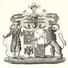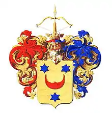 Описание герба: Выдержка из Общего гербовника В золотом щите червленый полумесяц с человеческим лицом, обращенный вверх, сопровождаемый вверху двумя лазуревыми шестиконечными звездами, а внизу одной лазуревой шестиконечной звездой. Щит увенчан дворянским коронованным шлемом. Нашлемник: золотой натянутый лук с золотой стрелой вверх. Намет: справа червленый с золотом, слева лазуревый с золотом. |