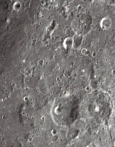 ![]() Снимок с борта Аполлона-16. Кратер Исидор в центра снимка, правее него кратер Капелла. | |