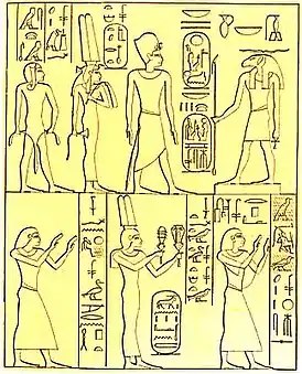![]() Стелла с изображением царской семьи. Рамсес II, Иситнофрет, сын Хаэмуас преклоняются Хнуму. Внизу слева направо: Мернептах, Бент-Анат и принц Рамсес | ||||||