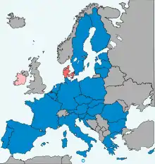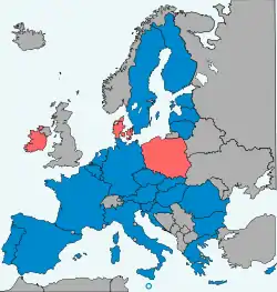 Все государства-члены, кроме Дании, либо приняли евро, либо обязаны сделать это по закону. Маастрихтский договор 1992 года включал протоколы о Великобритании[1] (в то время являвшейся государством-членом) и Дании, предоставлявшие им право исключения с правом решать, присоединятся ли они к евро и когда. Впоследствии Дания уведомила Совет Европейских сообществ о своем решении отказаться от евро, и это было включено как часть Эдинбургского соглашения 1992 года, решения Совета, принятого после первоначального отклонения Маастрихтского договора на датском референдуме 1992 года. Цель соглашения состояла в том, чтобы помочь в его утверждении на втором референдуме, что и было сделано. Решение Дании об отказе впоследствии было оформлено в измененном протоколе как часть Лиссабонского договора.