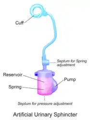 - Искусственный мочевой сфинктер с пружиной или 2-компонентное устройство: манжета и помпа.[3][4] Манжета располагается вокруг мочеиспускательного канала, а помпа имплантируется в мошонку. Давление в гидравлическом контуре создается пружиной помпы. Давление в ретропубикальном пространстве не оказывает никакого влияния на сфинктер данного типа.