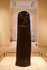 Замечательным памятником вавилонского искусства является рельеф на диоритовом столбе (высотой около 2 м) со сводом законов царя Хаммурапи, начертанным клинообразными знаками (Париж, Лувр). Рельеф изображает царя Хаммурапи в благоговейной позе перед сидящим на троне богом солнца и правосудия Шамашем, который передаёт ему символы власти — жезл и магическое кольцо (трон изображен в виде храмика на зиккурате). Подобные сцены вручения или «инвеституры», выражающие идею божественного происхождения царя, так как божество непосредственно передаёт ему знаки власти, часто встречаются на памятниках изобразительного искусства Передней Азии и в предшествующие и в последующие времена. Фигуры на рельефе торжественно статичны, позы бога и царя каноничны, но лицо Хаммурапи, несомненно, портретно.