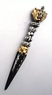 Ритуалы тибетского буддизма и религии бон требовали создания разнообразных культовых предметов, используемых в богослужениях. Для их изготовления применяли самые разные материалы: драгоценные металлы (особенно серебро), драгоценные и полудрагоценные камни, дерево, масло из молока яков, глину, бумагу, и даже человеческую кость. Ритуальные кинжалы «пхурба», с помощью которых изгоняли злых духов, обычно делали из железа и позолоченной бронзы. Из этого же материала делали «ваджру» (тиб. «дордже») — буддийский скипетр-символ, который в сочетании с колокольчиками «гханта» символизировал метафизическое соединение мужского и женского начала. Подобный скипетр-символ существует и у адептов религии бон — он называется «юнгдрунг» (санскр. «свастика»).