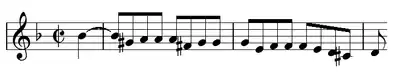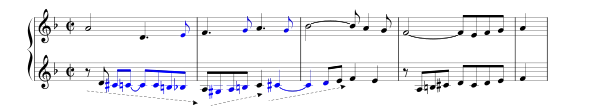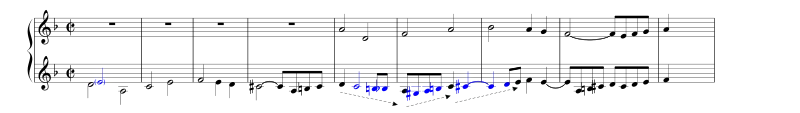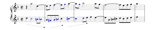 Позже появляется новая тема (с элементами синкопы) — вариация старой, также в противосложении с хроматической темой