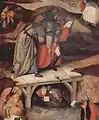 Справа изображён Иисус, упавший под тяжестью креста и остановивший процессию, движущуюся на Голгофу; Вероника устремляется к Спасителю, чтобы отереть пот с его лица. Палачей это промедление приводит в еле сдерживаемую ярость, обыватели же взирают на происходящее скорее с любопытством праздных зевак, нежели с состраданием. Чуть ниже разбойники исповедуются монахам в сутанах в капюшонах, причём Босх искусно передаёт отталкивающий облик этих клириков.
