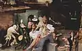 В нижней части под мостом через покрытый льдом ручей бесовская шайка слушает монаха, читающего неразборчивое письмо. К этой группе приближается птица на коньках, несущая в клюве послание с надписью «жирно» — насмешка над священниками, наживающимися на торговле индульгенциями.