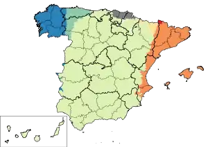 Средиземноморский морской: занимает средиземноморское побережье (исключая юго-восток), юго-атлантическое, Балеарский архипелаг, Сеута и Мелийя. Средние температуры варьируются между 13 и 16 °C. Летом температура поднимается до 22 °C, из-за влияния моря не слишком жаркие. Температура зимой не опускается ниже 10 °C.
