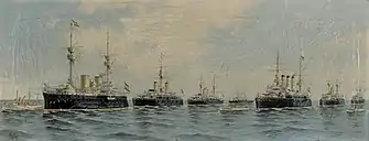 Десятинедельная война велась как на Карибах, так и в Тихом океане. Действия военно-морских сил США имели решающее значение, позволив экспедиционным силам высадиться на Кубе и захватить испанский гарнизон. Американцы добились капитуляции Сантьяго-де-Куба и Манилы, несмотря на ожесточённое сопротивление испанской пехоты[6]. Мадрид запросил мир после того, как две испанские эскадры в Сантьяго-де-Куба и Манильском заливе были потоплены, а третий флот, более современный, был отозван домой для защиты испанского побережья[7].