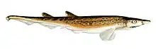 У спинных плавников тупые вершины, они сильно сдвинуты к хвосту. Основание первого спинного плавника находится над второй половиной основания брюшных плавников. Основание второго спинного плавника находится над серединой основания анального плавника. Грудные плавники большие и широкие, с закруглёнными концами. Брюшной плавник короткий, треугольный, у самцов имеются короткие птеригоподии, которые не достигают анального плавника. Анальный плавник существенно больше обоих спинных плавников. Его основание составляет 13—18 % и превосходит расстояние между спинными плавниками и промежуток между брюшными и анальным плавниками. Хвостовой стебель с боков сжат. Конец анального плавника сильно приближен к хвостовому плавнику. Длина хвостового плавника составляет 1/4 от общей длины, нижняя лопасть почти неразличима, возле кончика верхней лопасти имеется вентральная выемка. Кожа очень толстая. Тело покрыто мелкими, перекрывающими друг друга плакоидными чешуйками. На передней части дорсального края хвостового плавника имеется характерный пилообразный гребень, сформированный крупными чешуйками[17] . Окрас серовато-коричневый, по спине разбросаны 15—18 тёмных округлых пятен седловидной формы со светлыми краями. Брюхо и каудальные кончики спинных плавников белое. Внутренняя поверхность рта окрашена в чёрный цвет[18][20].
