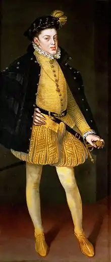- кальсес (исп. calzas) — разъёмные штаны-чулки. Мода изменяется от узких кальсес, в 1540-х годах возникновения двух самостоятельных слоев — нижнего широкого и верхнего из отдельных широких полос, когда верхняя часть кальсес получает форму бочонка. Затем употребление каркаса, а в 1570—1580-х годах — двойные кальсес, состоящие из узких облегающих ногу штанов и круглых на толстой набивке грегескос (исп. gregüescos), что означало «греческие» или «по-гречески», которые были широкими в бёдрах и покрывали только верхнюю часть ноги[5]. В 1590-х годах появились свободные и широкие вверху кальсес. Часто их отделывали вертикальными полосами декоративной ткани, которые прикреплялись вверху и внизу и свободно свисали по всей длине.