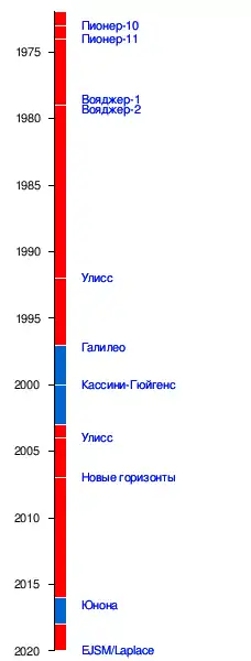 Хронология миссий по исследованию Юпитера. Синим цветом показаны орбитальные миссии