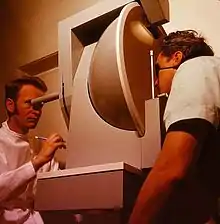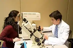 Тщательный осмотр передних структур глаза и придатков глаза часто выполняется с помощью щелевой лампы[2], которая представляет собой настольный микроскоп со специальным регулируемым источником освещения. Небольшой луч света, который может варьироваться по ширине, высоте, углу падения, ориентации и цвету, проходит через прозрачные среды глаза. Часто этот световой луч сужается до вертикальной «щели» во время исследования с помощью щелевой лампы. Офтальмолог осматривает освещенные структуры глаза через оптическую систему, которая увеличивает изображение глаза пациента, голова которого стабилизируется регулируемой опорой для подбородка.