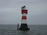 | Четырёхэтажный красно-белый маяк из стальных конструкций с тремя консольными эркерами расположен в Северном море, в устье реки Везер. Это первый в мире маяк, сооружённый в открытом море на зыбучем песке. Высота маяка над уровнем моря во время отлива — 31 метр, высота конструкции вместе с фундаментом — 52,5 метра[11]. | |||||||