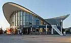 | Первое в мире крупное здание с бетонной крышей без опорных столбов, подвешенной на сетке предварительно натянутых тросов. Зал размером 86 х 46 метров имеет максимальную высоту 16 метров. Стеклянные стены придают зданию визуальную лёгкость и прозрачность[32]. | |||||||