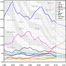Соотношение к мировому номинальных ВВП для стран с 10 наибольшими номинальными ВВП в 2010, с 1980 по 2010 с прогнозом МВФ до 2016. Серые линии показывают цены в современных долларах США.[1]