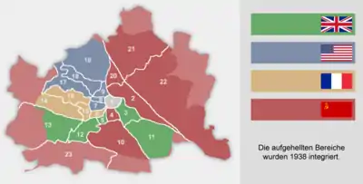 С согласия Москвы 3 июня 1945 года, до вступления в полномочия оккупационных властей в Вену прибыли представители трёх западных союзников для ознакомления с фактическим положением города с точки зрения разрушений, продовольственного снабжения и санитарной ситуации. Их отчёт описывал неблагоприятную картину, сложившуюся в городе с многочисленными бытовыми проблемами. 1 сентября 1945 года западные державы вступили в свои полномочия в согласованных секторах оккупации. В ноябре 1945 года в Вене прошли первые послевоенные коммунальные выборы. По результатам выборов Социал-демократическая партия Австрии получила в Венском городском совете 58 из 100 мандатов, Австрийская народная партия) — 36 и Коммунистическая партия Австрии — 6. В 1946 году был принят закон о территориальном делении, который в значительной степени отменил принятые в 1938 году положения о расширении городских границ. Советская администрация наложила вето на этот закон, которое было снято в 1954 году.