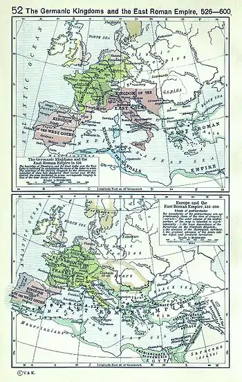 Деление Европы на Западную и Восточную усилилось после Падения Западной Римской империи в V веке, в результате завоевания тюрками Аттилы и Германскими племенами, в то время как Восточная Римская империя (называемая также Византийская империя) просуществовала ещё тысячу лет. Римская империя была уже разделена на греко-говорящие и латинско-говорящие регионы в течение многих столетий[25].