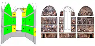 Художник не следовал хронологическому порядку легенды, предпочитая сосредоточиться на создании симметрии между расположением различных сцен. Большие фрески каждого яруса боковых стен капеллы задуманы как парные, сюжеты их подобраны с таким расчётом, чтобы они давали возможность сходного композиционного построения.