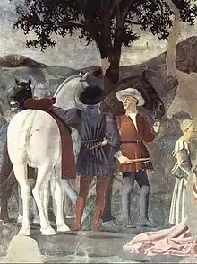 «Перенесение священного дерева», написана Джованни да Пьемонте, по картону Пьеро. Испугавшись пророчества, Соломон, по легенде, приказал закопать брус, однако тот, спустя тысячу лет, был найден при строительстве бассейна для омовения жертвенных животных и пошёл на изготовление орудия казни Иисуса Христа. |