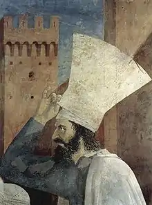 «Обретение и испытание Животворящего Креста». Изображено обретение Креста святой Еленой в ходе её раскопок в Иерусалиме. Поскольку было обнаружено три креста, то для определения Истинного, согласно «Золотой легенде», епископ Макарий возлагал кресты на мертвеца, проносимого мимо места раскопок, и Крест Господень воскресил усопшего.[4] |