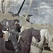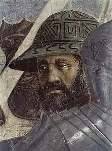 «Сновидение Константина». Изображёно явление во сне Константину Великому ангела, пообещавшему победу Константину, если на щиты его войнов будет нанесена монограмма Христа — «ХР». Обещание сопровождалось явлением на небе знамения креста с надписью «Сим победиши!» (лат. In hoc signo vinces). Вазари наиболее восхищается этой фреской, написанной Пьеро «…его талант и искусство в том, как он написал ночь и ангела в ракурсе, который спускается, неся знамение победы Константину, спящему в шатре…, и освещает своим сиянием и шатер, и воинов, и все околичности с величайшим чувством меры».[2] |