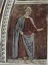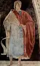 «История царицы Савской» («Поклонение царицы Савской священному Древу»). Изображена история посещения волшебницей и сивиллой царицей Савской царя Соломона. По пути в Иерусалим она преклонила колени перед брусом, служившим мостом через ручей. По легенде, он был сделан из дерева, проросшего из ветви Древа познания Добра и Зла, вложенной в рот Адама при его погребении, а впоследствии выброшенной при строительстве Иерусалимского храма. Поклонившись ему, она предрекла, что Спаситель мира будет повешен на этом древе, и оттого царству иудеев придёт разорение и конец.[1] |