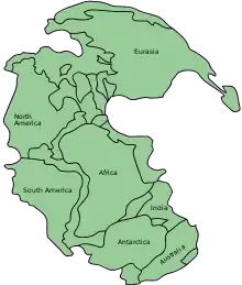 На протяжении всей истории Земли были периоды, когда континентальные массы собирались вместе, чтобы сформировать суперконтинент. После чего суперконтинент распадался и новые континенты расходились. Это повторение тектонических событий называется циклом Уилсона. Чем дальше назад во времени, тем труднее интерпретировать полученные данные. По крайней мере ясно, что примерно 1000—830 млн лет назад большинство континентальных масс были объединены в суперконтинент Родиния.[124] Родиния не первый суперконтинент. Он сформировался ~1,0 млрд лет назад за счёт аккреции и столкновения осколков от распада более старого суперконтинента, который называется Нуна или Колумбия, и который сформировался 2.0-1.8 млрд лет назад.[125][126] Это означает, что процесс тектоники плит, аналогичный сегодняшнему, вероятно был активен и в протерозое.