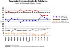 В начале XXI в. каталонская элита и общество разделились на тех, кто требует большей независимости от Мадрида вплоть до государственного самоопределения, и сторонников существующей автономии. Среди каталонцев отношение к независимости Каталонии неоднозначно. Весьма значительной является часть каталонцев, которые не определились со своим отношением к независимости Каталонии, и их число все время меняется; около 40 % жителей Каталонии выражают негативное отношение. Доля тех, кто выступает за выход из состава Испании, составляет около трети населения (это число остаётся стабильным). Следует учитывать, что среди сторонников независимости Каталонии есть и те, кто предпочел бы видеть в составе вновь созданного каталонского государства так называемые каталонские земли.
