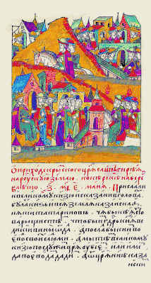 Миниатюра Лицевого летописного свода XVI в.: "О приходе Крымского царя Саип-Гирея на Рускую землю к Оке реке на берег."