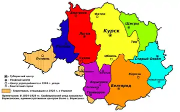 В 1924 году число уездов сократилось до 7 (были упразднены 8), в 1925 согласно комиссии по уточнению границ РСФСР, БССР и УССР Курская губерния уступила УССР почти всю территорию Путивльского уезда и ещё некоторые территории. В 1928 году губерния была ликвидирована, её территории вошли в состав Центрально-Черноземной области, которая была разделена в 1934 году, на Воронежскую и Курскую области, в состав последней вошло 60 районов. Курск стал центром новообразованной области.