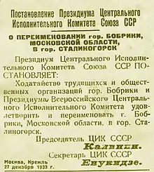 23 декабря 1933 года Бобриковский химический комбинат начал давать продукцию. Этот день считается днём pождения Новомосковского химического комбината. Шестеро[прим 1] участников строительства были награждены высшей наградой Советского Союза (на тот момент времени) — орденом Ленина[8], и ещё 12 первостроителей — орденом Трудового Красного Знамени[4]. На торжественном митинге с участием народного комиссара тяжёлой промышленности Серго Орджоникидзе было озвучено обращение первостроителей к руководителям Партии и Правительства с просьбой переименовать Бобрики в Сталиногорск (в честь секретаря ЦК ВКП(б) И. В. Сталина). Через несколько дней просьба была исполнена, и 27 декабря город был переименован в Сталиногорск, а комбинат стал носить название Сталиногорский химический комбинат.