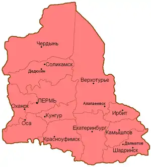 - В Пермскую область вошли уезды: Пермский, Чердынский, Соликамский, Оханский, Осинский, Кунгурский, Красноуфимский, Обвинский;