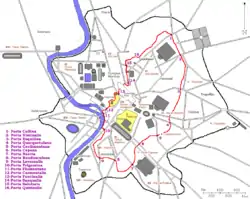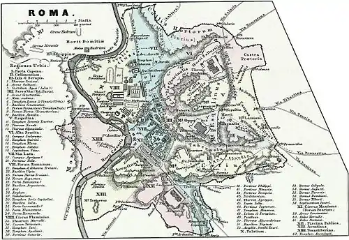 В истории роста древнего Рима как города можно отметить несколько эпох, соответствующих эпохам территориального и государственного развития римского государства. Первая эпоха представляет жизнь города до укрепления его так называемой Сервиевой стеной и соответствует так называемому царскому периоду истории Рима, вторая заканчивается строительной деятельностью Цезаря и соответствует эпохе постепенного превращения города-государства в империю; третья охватывает время первых императоров до Септимия Севера; четвёртая — время до V в. н. э. О численности населения Рима в республиканскую и императорскую эпохи нет точных сведений; Белох[1] определяет население Рима во времена Суллы в 400 тыс., а в II—III вв. н. э. — в 800 тыс. человек.