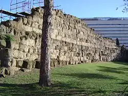 В конце III в., при Аврелиане и преемнике его Пробе, граница была фиксирована укреплениями; Рим вновь сделался укреплённым городом. Новые укрепления — Стена Аврелиана — охватывали весь город с его затибрской частью. Они совпадали с таможенной линией и отчасти с границей померия, но во многих случаях в пределы стены были введены и гробницы (в том числе пирамида Цестия и гробница Еврисака). Стена сохранилась до нашего времени почти на всём своём протяжении. Выстроена она очень прочно; сзади внешней стены (кирпичной, как и все другие постройки), в 1,33 м, идёт ряд соединенных арками столбов, связанных со стеной сводом, над сводом зубцы, вся толщина 3,80 м, высота 16 м; местами четырёхугольные башни; в стене 14 ворот, фланкированных круглыми башнями.