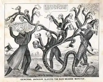Ещё одной серьёзной проблемой администрации Джексона стал отзыв лицензии Центрального банка Соединённых Штатов. Его деятельность резко критиковали малоимущие слои населения, особенно в западных штатах, обвиняя в монополизме в сфере кредитования и предоставлении преимуществ наиболее богатым людям[14]. Борьба за равные возможности независимо от размеров личного состояния была одним из предвыборных обещаний Джексона.