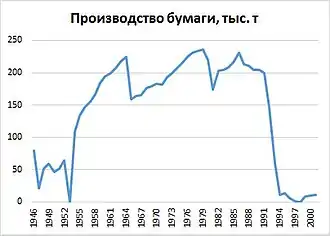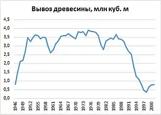 Лесная и целлюлозно-бумажная отрасли промышленности достигли пика своего развития. В 1975 году вывозка древесины составила 3,9 млн кубических метров, после чего в отрасли начался спад. Это было связано с истощением запасов древесины (ель и пихта) вследствие 70-летней активной эксплуатации лесов и лесных пожаров. Местные ЦБЗ за весь период так и не смогли выйти на показатели, определенные советским руководством в 1964 году, по производству целлюлозы (500—600 тысяч тонн) и бумаги (250—300 тысяч тонн)[31].