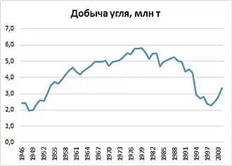 Угледобыча в начале рассматриваемого периода развивалась устойчиво: внедрялись средства автоматизации, увеличивалось количество горных машин и комбайнов. Шахтеры обеспечивали углем всех потребителей области, в отдельные годы даже наблюдались сложности со сбытом топлива. В 1979 году добыча угля достигла максимального за весь советский период значения в 5,8 млн тонн. В 1980-е годы начался спад отрасли из-за выбытия мощностей, к тому моменту действовали 13 шахт, Лермонтовский и Новиковский угольные разрезы. Так, в 1984 году добыча составила 4,7 млн тонн, что было меньше уровня 1965 года. При этом потребности региона в угле составляли 5,5 млн тонн, в результате область нуждалась в привозном угле[32]. Если в общем топливном балансе страны уголь в конце 1970-х годов составлял около половины, то в Сахалинской области — почти три четверти[33].