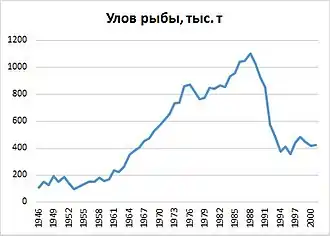 Ведущей отраслью промышленности Сахалинской области в период «развитого социализма» оставалась рыбная. На нее приходилось 40—45 % всей выпускаемой промышленной продукции. За данный период добыча рыбы выросла в 2,4 раза (с 382 до 931 тысячи тонн), производство рыбных консервов — в 3,8 раза (с 74 до 278 млн условных банок). Активное развитие получило океаническое рыболовство. Две трети улова островных рыбаков составлял минтай. Переработка улова и выпуск товарной продукции производились преимущественно в районах промысла на плавбазах, судах типа БМРТ и РТМС. В 1976 году СССР, как и многие другие страны в тот период, установил 200-мильную экономическую зону. Вести промысел в чужих водах стало сложнее, но это позволило снова обратить внимание на собственную сырьевую базу: акватории Японского и Берингова морей, почти все Охотское море и прилегающую к Курильским островам полоса Тихого океана. Если в 1971 году сахалинские рыбаки добывали в Сахалино-Курильском бассейне половину своего улова, то в 1976 году — около 80 %. Данная тенденция обратила внимание советской администрации на проблему воспроизводства биологических ресурсов у своих собственных берегов, особенно критическим было положение лососевых. Было открыто 18 новых рыбоводных заводов[29]. Увеличение флота сформировало запрос на модернизацию судоремонтной отрасли: в Невельске был реконструирован судоремонтный завод с сухим доком, в Холмске построен судоремонтный завод с судоподъемным слипом, организованы судоремонтные цеха в Корсакове, Александровске-Сахалинском, Северо-Курильске[30].