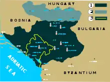 В 1035 году в Дукле произошло антивизантийское восстание во главе с Воиславом, которое закончилось его поражением. Воислав был уведён в Константинополь, но после побега ему удалось взять власть в Дукле, Травунии и Захумье в свои руки. В 1040—1041 годах в западной части Балканского полуострова произошло восстание. В 1042 году византийское войско разграбило Дуклю. В ответ войска Воислава нанесли византийцам тяжёлое поражение. После этого Воислав создал независимое Дуклянское государство. После Воислава власть перешла его сыну Михаилу (ок. 1050 — ок. 1082), который включил в своё государство Рашку. В 1077 году папа Григорий VII по просьбе Михаила предоставил ему титул короля[20]. Он был первым известным сербским королем.