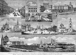 В 1654 году случилась страшная эпидемия чумы, а 10 июля 1658 года — страшный пожар, уничтоживший почти целиком Земляной и Рубленый города и даже Тропинскую слободу за Которослью. Погибли тысячи людей, сгорело 29 церквей, 3 монастыря, 1,5 тысячи дворов и городские стены с башнями, построенные в начале XVII в. (24 башни Земляного и 12 башен Рубленого города).[33] Пережили пожар Успенский собор, церкви Николы Надеина, Рождества Христова (построена в 1644) и Ильи Пророка, но Успенский собор сильно пострадал в пожаре 1670 года и через несколько лет был выстроен заново.