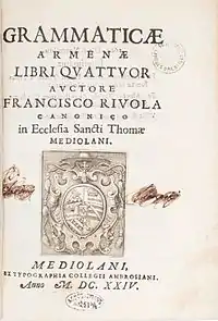 В начале XVII столетия жил итальянский арменист Франческо Ривола, издавший в 1624 году[97] армянскую грамматику. Его труд, открывавший эпоху, свободен от сильной латинизации и «рационализации» грамматических правил, что стало свойственно позднейшим авторам. Так как Ривола недостаточно владел армянским языком, его исследование, состоящее из четырёх частей, представляет собой смесь классического армянского и диалектных форм. Среди прочих недостатков грамматики Риволы — передача произношения армянских букв на основе западноармянского произношения, притом без точной очерёдности, а также неверное описание морфологических форм, часто с опорой не на армянский язык, а на латынь[98]. Книга стала первой печатной грамматикой армянского языка[40].