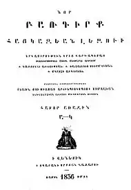 Новый период армянской лексикографии делится на два этапа — с начала XIX века до 1870-х годов и с 80-х годов XIX века до советизации Армении[128]. «Новый словарь древнеармянского языка» (т. 1—2, 1836—1837) Габриэля Аветикяна, Хачатура Сюрмеляна и Мкртича Авгеряна содержит большой пласт лексики грабара и до сих пор считается одним из основных источников для его изучения. Исходя из поставленных филологических задач, авторы приводят греческие и латинские эквиваленты армянских слов, а также их турецкие аналоги для западных армян. На основе «Нового словаря…» в 1846 году вышел доступный словарь, второе, дополненное издание которого (1865) содержало более 5 тысяч новых слов. Армяно-латинский словарь Манвела Джахджахяна (1837) по представленности лексики грабара сопоставим с «Новым словарём древнеармянского языка»[117].