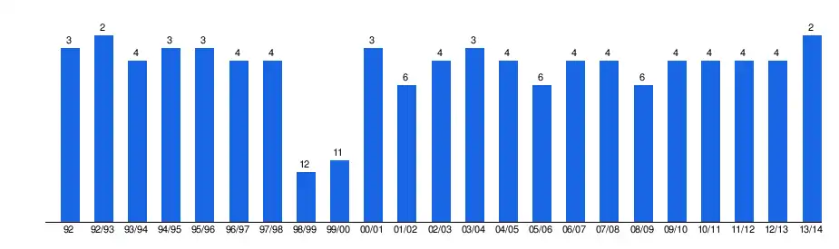 | Сезоны | И | В | Н | П | З | П | Сезоны | И | В | Н | П | З | П | Сезоны | И | В | Н | П | З | П | Сезоны | И | В | Н | П | З | П | Сезоны | И | В | Н | П | З | П |