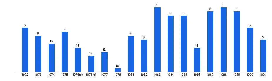 | 1977 | Высшая лига | 30 | 9 | 9 | 12 | 24 | 31 | 27 | 12 | 1/8 финала | |||||