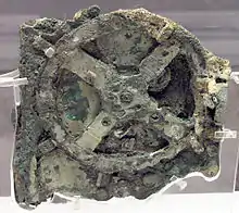 Антикитерский механизм считается самым ранним из известных механических аналогов компьютера[4]. Он был предназначен для расчёта астрономических позиций. Такой механизм был обнаружен в 1901 году на развалинах греческого острова Андикитира между Китирой и Критом и был датирован 100 г. до н. э. Технологические артефакты подобной сложности больше не появлялись до XIV века, когда в Европе были изобретены механические астрономические часы[5].