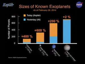 - 26 февраля 2014 НАСА объявили об открытии сразу 715 экзопланет в 305 системах с помощью телескопа «Кеплер», что увеличило количество известных экзопланет почти в два раза[67][68][69].