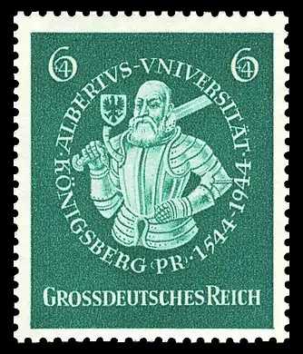 Альбрехт, последний великий магистр Тевтонского ордена и первый герцог Пруссии, на марке Третьего рейха, посвящённой 400-летию Университета Кёнигсберга (1944)