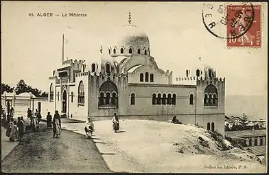 1908: медресе в Алжире. Открытка, франкированная маркой Франции типа «Камея Сеятельница»[5] и погашенная календарным штемпелем города Алжира[^]